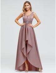 Vestido elegante de fiesta de cóctel para invitados de boda, corte A, escote en V, espalda en V, sin mangas, asimétrico, de poliéster con cristales y cuentas.