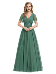 Vestido de fiesta estilo imperio con corte A para invitada de boda, escote en V, espalda en V, manga corta, largo hasta el suelo, de gasa con pliegues y fruncido. - Trébol / EE. UU. 2 / Reino Unido 6 / UE 32