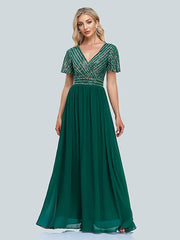 Vestido de noche elegante de corte A, largo hasta el suelo, manga corta, cuello en V y lentejuelas