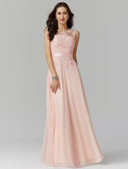 Vestido de noche de corte A, cintura alta, para dama de honor, invitada de boda, de gasa, largo hasta el suelo, sin mangas, cuello ilusión, georgette con apliques - Rosa perla / EE. UU. 2 / Reino Unido 6 / UE 32