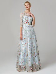 Vestido de noche de corte A, vestido de fiesta, vestido floral, vestido de fiesta para invitados de boda, largo hasta el suelo, manga 3/4, cuello ilusión, encaje con bordado