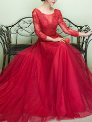 Vestido de noche de corte A, vestido de fiesta, vestido de lujo, para invitada de boda, compromiso, cola capilla, media manga, cuello ilusión, tul con apliques de cuentas.