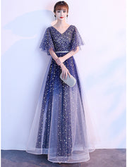 Vestido de fiesta de cumpleaños con corte A, escote en V, manga corta, largo hasta el suelo, de tul con faja/cinta y cristales