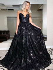 Vestidos de lentejuelas sin mangas con escote en V y corte princesa hasta el suelo
