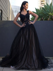 Vestidos de corte A/princesa con tul, encaje, escote corazón, sin mangas, con cola larga