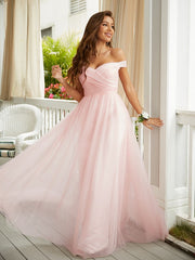 Vestidos de tul con corte A/princesa, fruncidos, hombros descubiertos, sin mangas y hasta el suelo