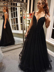 Vestidos de corte A/princesa de tul con tirantes finos, cuentas y largo hasta el suelo, sin mangas