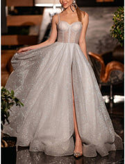 Vestidos de fiesta de corte A, elegantes, formales, largos hasta el suelo, sin mangas, escote corazón, con lentejuelas y brillo, pliegues y abertura.