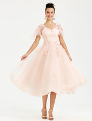 Vestidos de fiesta de corte A, elegantes, para invitados de boda, cóctel, hasta la rodilla, manga corta, escote en V, tul con apliques