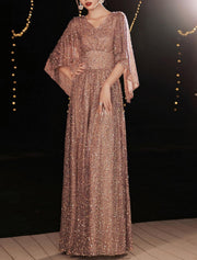 Vestidos de fiesta de corte A, elegantes, para invitados de boda, hasta el suelo, media manga, escote en V, satén con lentejuelas