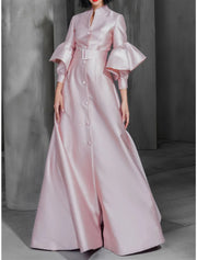 Vestidos de fiesta de corte A, elegantes, para invitados de boda, para graduación, hasta el suelo, manga larga, cuello alto, satén con faja/cinta, botones y volantes.