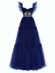 Vestidos de fiesta de corte A, elegantes, para invitados de boda, de graduación, hasta el suelo, manga corta, hombros descubiertos, tul con pliegues y volantes - EE. UU. 2 / Reino Unido 6 / UE 32