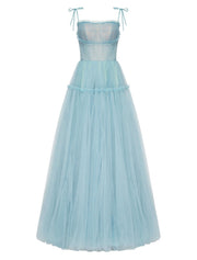 Vestido de fiesta de graduación de corte A, elegante, para invitada de boda, largo hasta el suelo, sin mangas, tirantes finos, de tul con pliegues y volantes. - Azul cielo / EE. UU. 2 / Reino Unido 6 / UE 32