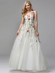 Vestidos para ocasiones especiales de corte A, vestido floral, para invitados de boda, regreso a casa, largo hasta el suelo, sin mangas, cuello en V, encaje con apliques bordados - EE. UU. 2 / Reino Unido 6 / UE 32