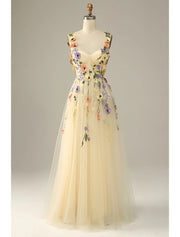 Vestido de novia de corte A, para invitada, floral, para fiesta, graduación, largo hasta el suelo, sin mangas, tirantes finos, de tul con apliques - EE. UU. 2 / Reino Unido 6 / UE 32