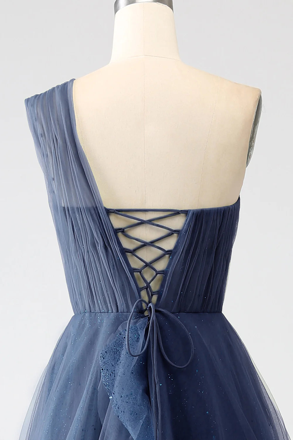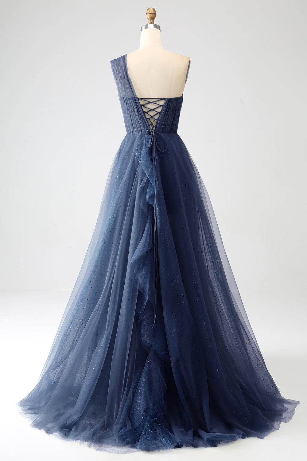 Vestido de fiesta largo de tul verde oscuro con corte en A y un solo hombro
