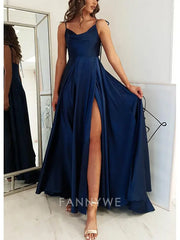 FannyWe Simple A Line Vestidos de Invitada de Boda Vestido Elegante Formal Prom Hasta el Suelo Sin Mangas Tirantes Espagueti Satén con Tirantes Fruncido