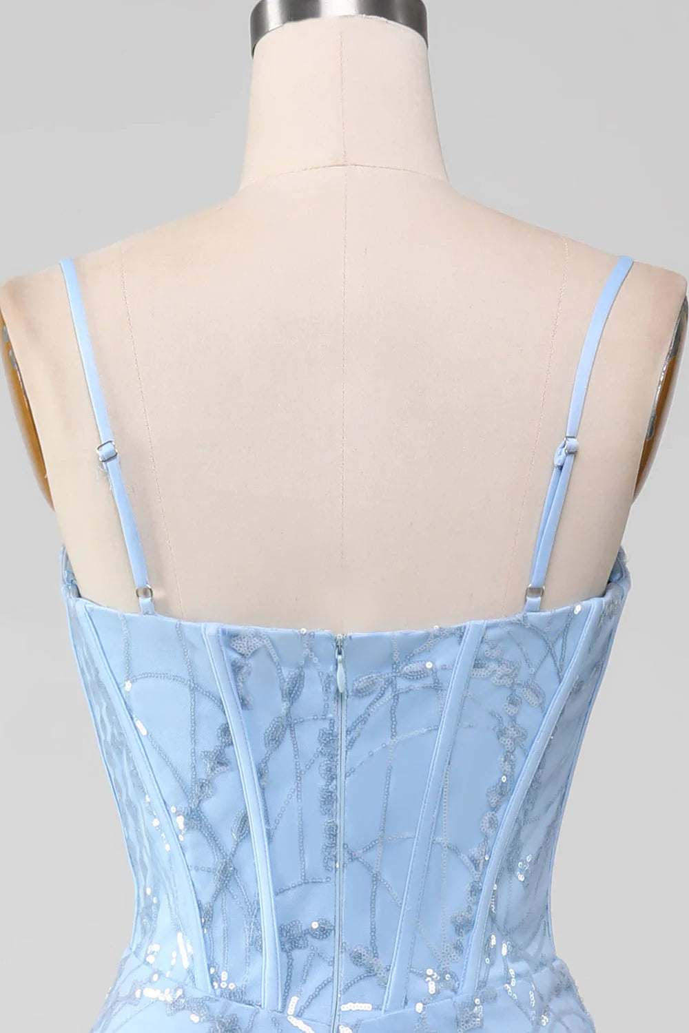 Vestido de fiesta largo con corsé y lentejuelas brillantes de sirena azul claro