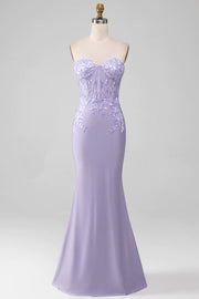 Vestidos de fiesta con corsé, sin tirantes y corte en lila con apliques de encaje