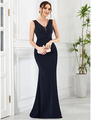 Vestido de noche de sirena/trompeta, brillante, para graduación, boda, fiesta, largo hasta el suelo, sin mangas, cuello en V, poliéster con cinturón