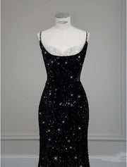 Vestido de noche de sirena/trompeta, sexy, formal, largo hasta el suelo, sin mangas, tirantes finos, con lentejuelas y lazo(s), cristales y lentejuelas
