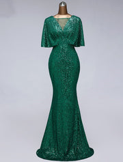 Vestidos de fiesta de sirena/trompeta, vestido brillante, para invitadas de boda, para graduación, largo hasta el suelo, media manga, cuello ilusión, con lentejuelas y volantes de lentejuelas
