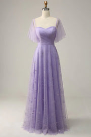 Vestido de fiesta lavanda con hombros descubiertos y volantes