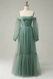 Vestido de fiesta de tul en línea A, gris y verde, con hombros descubiertos y mangas largas