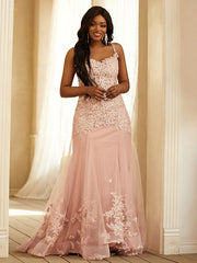 Vestidos de tul con apliques, tirantes y corte tubo, sin mangas y con cola larga
