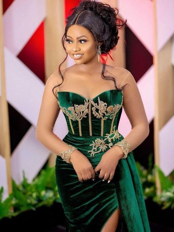 Vestidos de terciopelo con apliques, escote redondo, sin mangas y cola larga