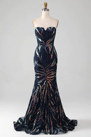 Vestido de fiesta largo de sirena con lentejuelas y brillantes en azul marino