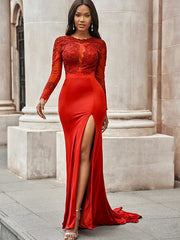 Vestidos de corte trompeta/sirena con apliques de licra, escote redondo, mangas largas y cola larga - EE. UU. 2 / Reino Unido 6 / UE 32