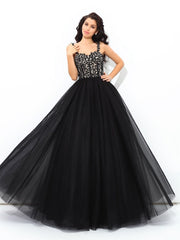 Vestido de quinceañera sin mangas con tirantes de red y largo hasta el suelo con apliques