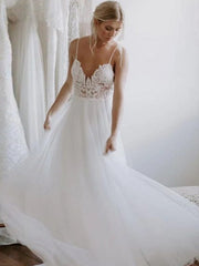 Vestidos de novia de corte A/princesa con apliques de encaje, escote en V, sin mangas y cola larga