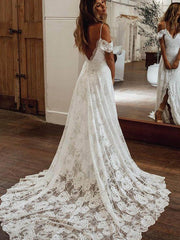 Vestidos de novia de corte A/princesa, con encaje, volantes, escote en V, sin mangas y cola larga
