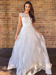 Vestidos de novia de corte A/princesa, sin mangas, con escote redondo y cola de cepillo