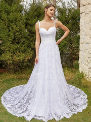 Vestidos de novia de corte A/princesa con encaje, tirantes finos, sin mangas y cola capilla