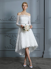 Vestidos de novia asimétricos de encaje con mangas largas y hombros descubiertos, corte princesa/A