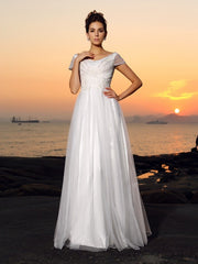 Vestido de novia largo de tul con mangas cortas, corte princesa, hombros descubiertos y cuentas para playa