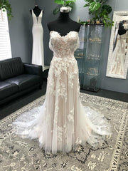 Vestidos de novia de corte A/princesa, sin mangas, con apliques de tul y hombros descubiertos, con cola de corte - EE. UU. 2 / Reino Unido 6 / UE 32