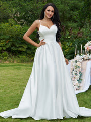 Vestidos de novia de corte A/princesa, satén, lazo, escote en V, sin mangas, cola larga
