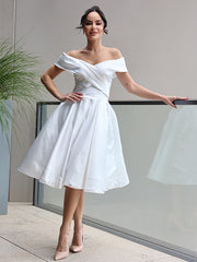 Vestidos de novia de satén con volantes, corte princesa, hombros descubiertos, sin mangas y hasta la rodilla - EE. UU. 2 / Reino Unido 6 / UE 32