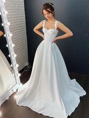 Vestidos de novia de corte A/princesa, de satén, con volantes, tirantes, sin mangas y cola larga