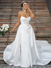 Vestidos de novia de satén con volantes, corte A/princesa, escote corazón, sin mangas y cola capilla