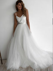 Vestidos de novia de corte A/princesa, tirantes finos, tul, sin mangas, volantes y cola larga