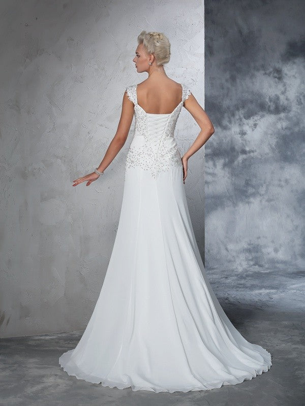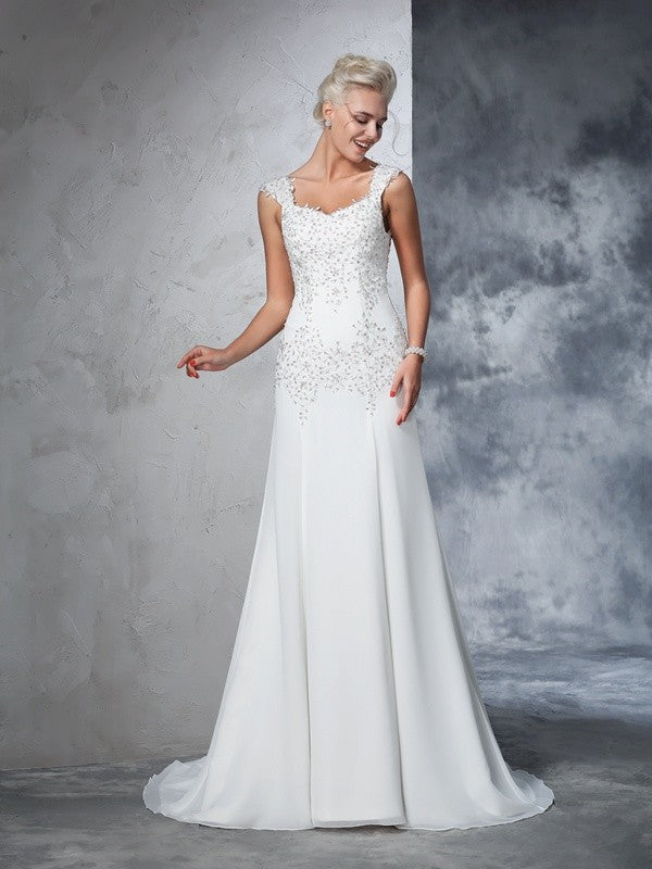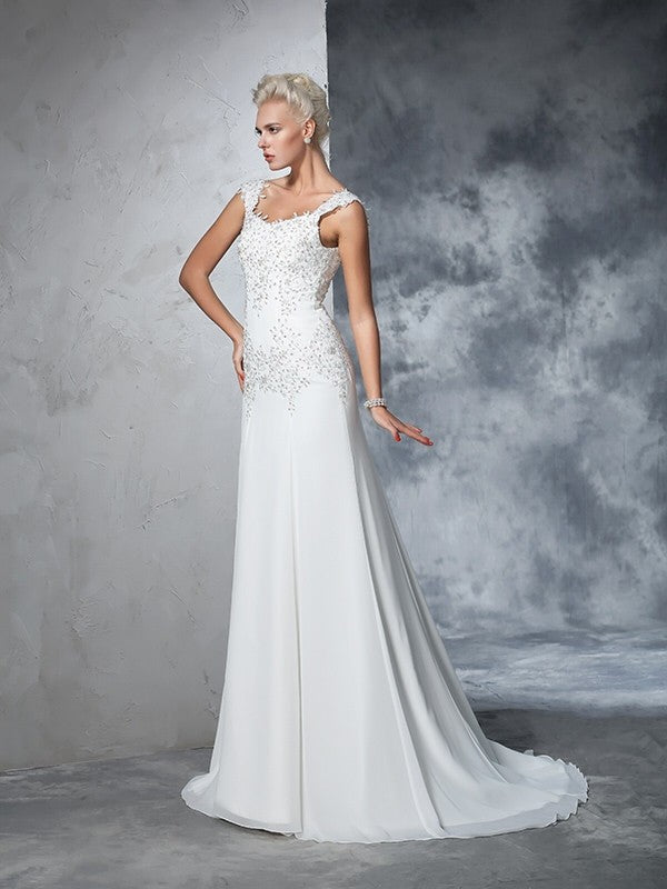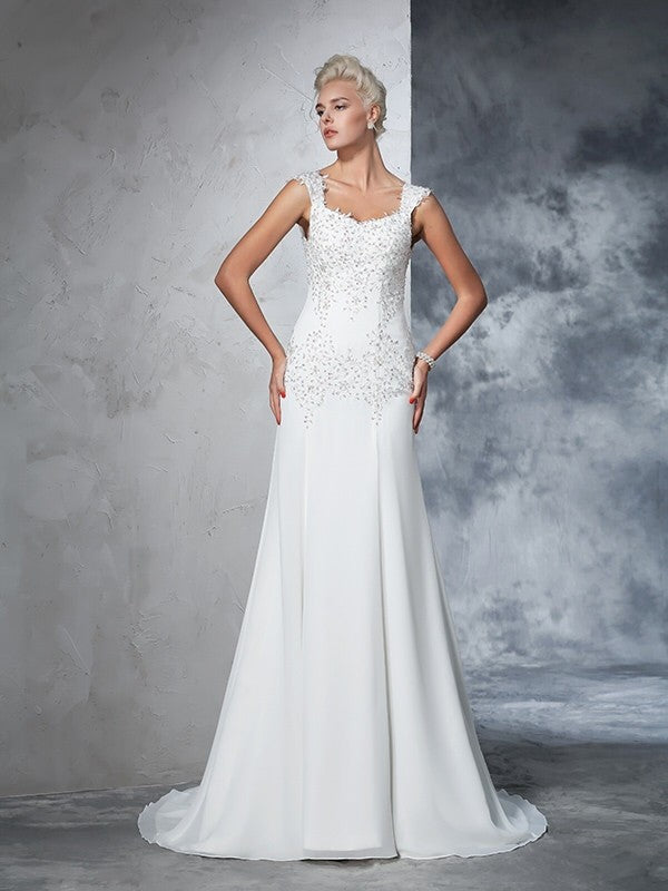 Vestidos de novia largos de gasa sin mangas con tirantes princesa y cuentas