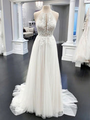 Vestidos de novia de corte A/princesa, con tul, apliques, halter, sin mangas y cola larga