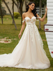 Vestidos de novia de corte A/princesa con apliques de tul, hombros descubiertos, sin mangas y cola capilla