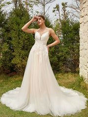 Vestidos de novia de corte A/princesa con apliques de tul, escote en V, sin mangas y cola de corte
