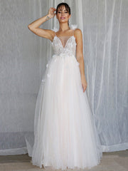 Vestidos de novia de corte A/princesa, escote en V, abalorios, sin mangas, tul, hasta el suelo